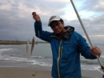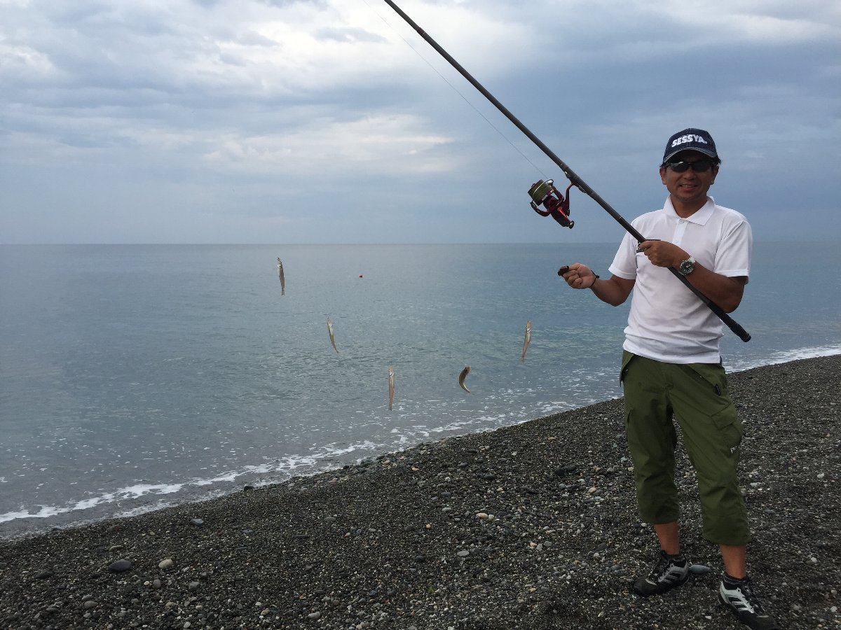 報知キス会場の福井三里浜から、石川富山を通り越して200kmのドライブ。新潟南端の親不知海岸に到着したのは16時過ぎ。道中数カ所で土砂降りだったけれど、親不知は曇り空。1投目3色付近でキスの魚信。最大17cm5連キス。2投目、3投目も各1匹。