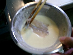 天ぷら粉を付けます。スーパーにはピンからキリまで天ぷら粉が売っていますが、やっぱり高い天ぷら粉は旨いですね。