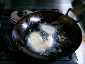 揚げます。揚げた直後につまみ食いするのが一番おいしいです。食卓に卓上コンロを置いて、揚げながら食べるのが理想ですが、食卓が油だらけになるので、困ります。.