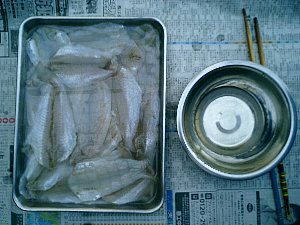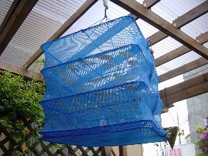 1匹ごとに、日本酒または料理酒にさっと浸けて、干しカゴの中に並べます。表側を下にして干します。そうすると表面に編み目が付いて見た目にきれいです。裏側を下にすると網に身が付いて取れなくなる事があります。