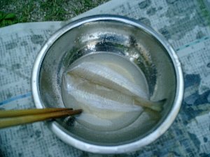塩水(3~5%)に20分浸けます。塩分濃度は海水程度です。塩水を舐めてみて海水程度になればOKでしょう。日本酒または料理酒を用意します。右側の写真のように少しで良いです。