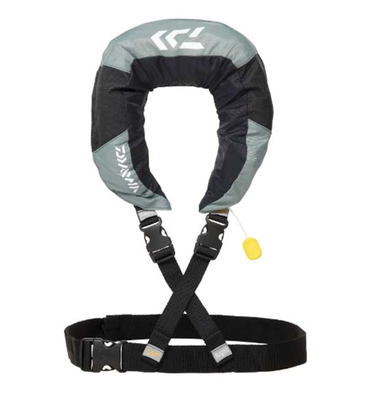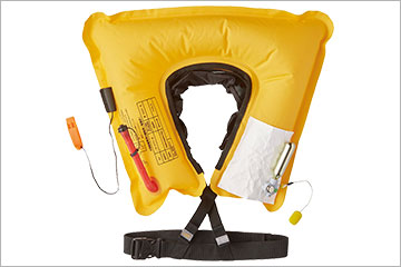 手動膨脹式ライフジャケット。より簡単に着用ができるバックル仕様。