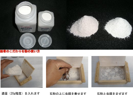 虫餌に「拙者のこだわり石粉」を混ぜると、すべり止め効果とともに虫餌に噛まれることも少なくなり、快適な餌付けが可能になります
