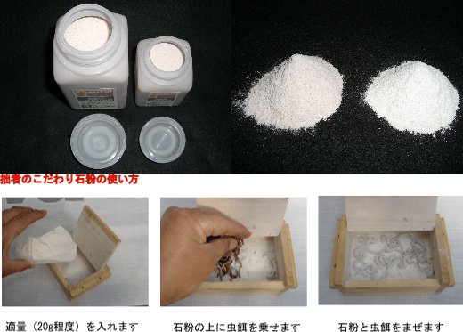 虫餌に「拙者のこだわり石粉」を混ぜると、すべり止め効果とともに虫餌に噛まれることも少なくなり、快適な餌付けが可能になります