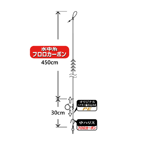 水中糸を4.5m、中ハリスと水中糸をチチワで接続するオールフロロカーボンのシンプルな定番の張替仕掛です。ハナカンは「楽勝ハナカン」、サカサは「楽勝サカサ」を採用。扱いやすさ抜群です。