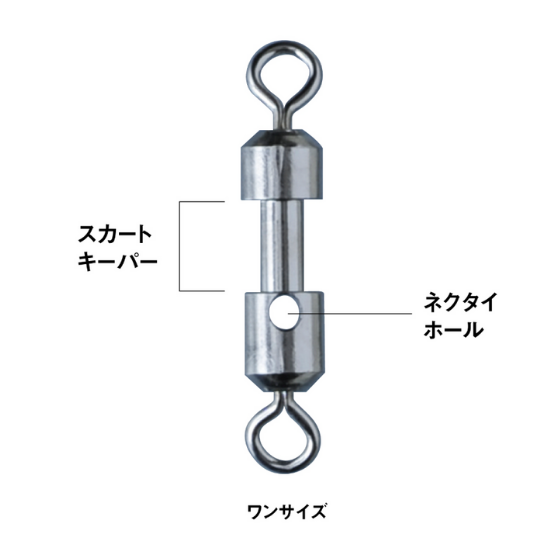 特殊な製法を用い、強度を損なうことなく表面の滑らかな穴をど真ん中に開けた今回のスイベル。この穴に専用ネクタイを通すことにより、ネクタイを左右均等にフレアさせつつ、引き抵抗を最小限にしながらも高アピールのネクタイセッティングが可能になりました。(GM-1883 スレッダーを使うとネクタイを簡単に装着できます。)