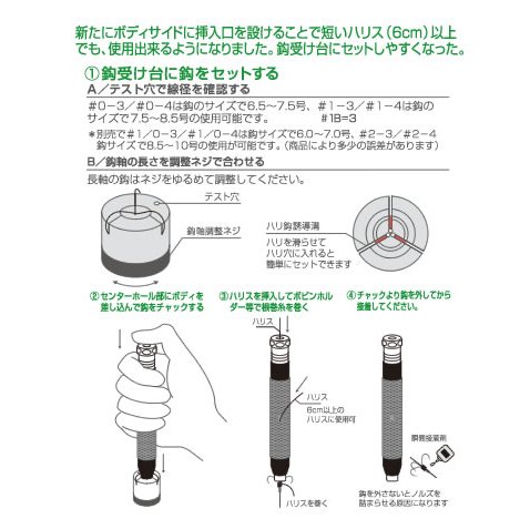 ボディー中央部にハリス穴を施しハリス6cm以上から使用可能。