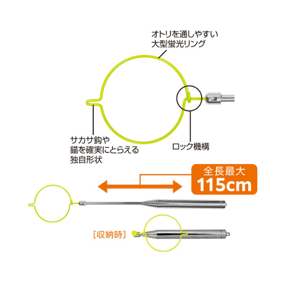 大型蛍光リングが水中でも見やすく、ロック機構で糸外れなし。