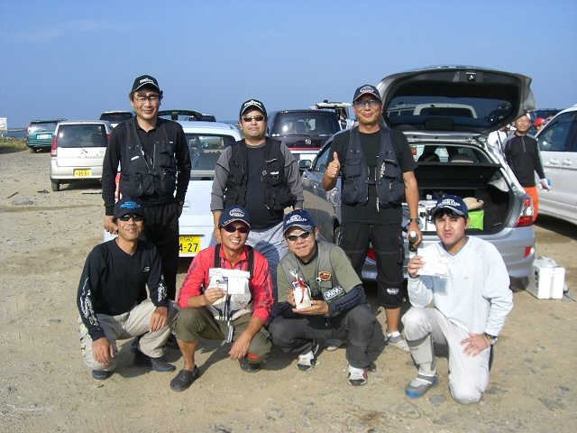 しかし、ドラマチックな事は何も起きず、そのまま、試合終了。負けました。検量結果は、Jellyさん120g、ABE組長76g、拙者74g、たったの2g差。超ピンギス1匹分とは。でも目標通り3位に入って満足としよう。表彰式終了後、ABE組長を拉致して3人で無理矢理記念撮影。