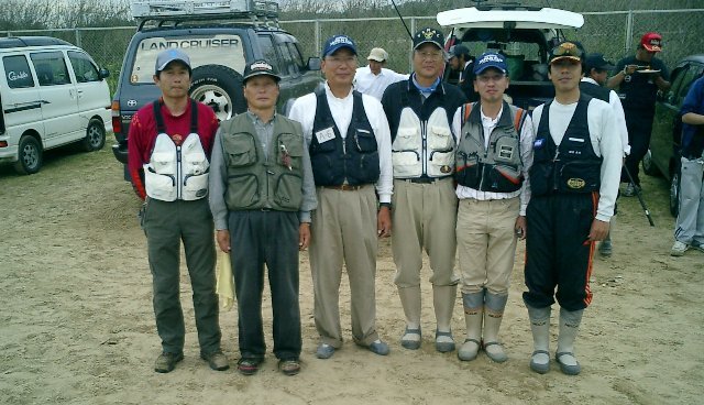大会の朝、3時起き、JCの時は朝飯にWestのうどんを食べてボーズだったので、<絶対うどんは食べない>と決め、いつものラーメン屋で290円也のいつものラーメンを食べて、新松原にGO。4時半に到着。受付終わって、まだ暗い中、むらさきさん、國さん、80グラムさん発見。「おはようございまーす。」雑談している間に徐々に夜が明けてきた。そー言えば、確か今回の大会には、投げ釣り界の超有名人、シマノインストラクターの横山さんが来ているはず。なんと80グラムさんの隣の車が横山さんだった。奥さんとご一緒とは予想外。「拙者の投げ釣りステッカー渡そうか・・・」「クーラーに黙ってステッカー貼ろうか・・・」などと、バカな話で盛り上がった。